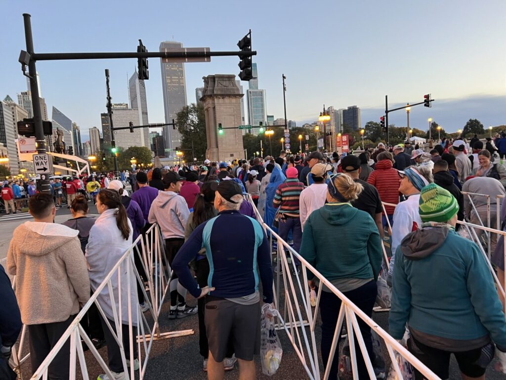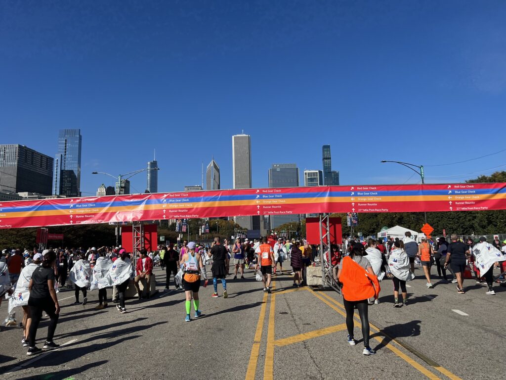 Another thing to note here is that the Chicago Marathon donates all clothing and attire left in the starting area. If it’s cold, don’t plan to check your outer layers. You’ll have to shed and check them too early. Instead, bundle up in old clothes and ditch them right before you start. You’ll stay warm longer, and your clothes will go to a good cause.