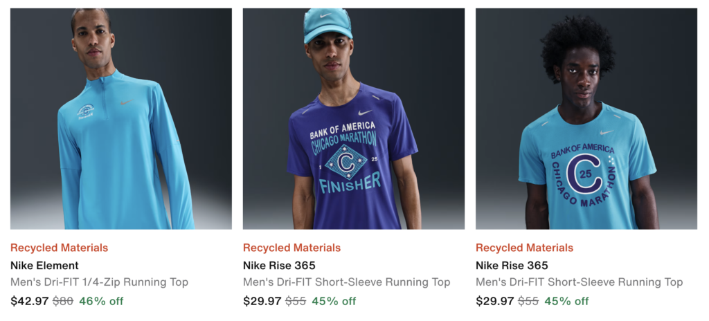 The Nike store on Michigan Ave sells the full line of Chicago Marathon apparel, including everything that’s available at the Expo (while supplies last). More importantly, the Nike Store on Michigan Ave is the main (sometimes only) place to find finisher gear. It’s usually released on Saturday and Sunday of race weekend.