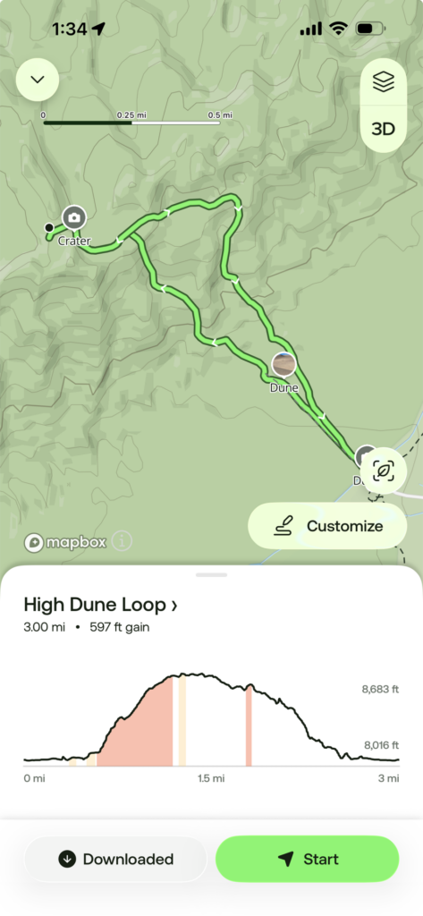 Another helpful thing is to download the High Dune trail in AllTrails or save the location offline on Google Maps. You might not be able to find and follow the exact trail, but it will help provide general direction on where the dune is compared to where you are.
