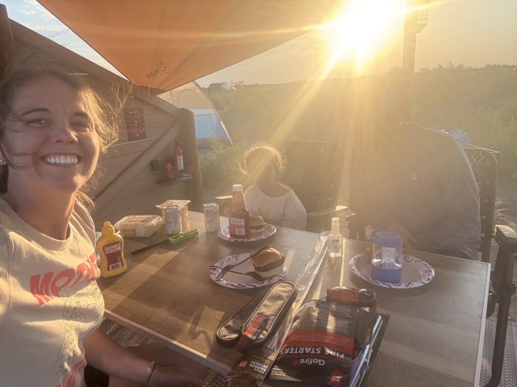 During our 2-night visit, we stayed at Ramble at Great Sand Dunes National Park. It was incredible. Think of it as elevated camping, but not quite glamping. We needed to bring our own tent, but the site was otherwise stocked with the essentials (like tables, chairs, grills). There were other creature comforts like a playground and games (bags, disc golf), self-service cantina (with basic food and drinks, including coffee), and clean bathrooms with hot showers.