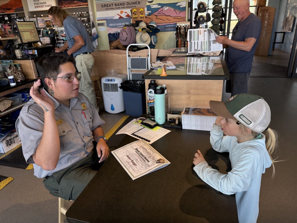 All of the National Parks have some version of the Junior Ranger Program. Zoe has earned several badges. Some parks definitely take it more seriously than others and really check your work. Great Sand Dunes was pretty chill. The ranger quickly skimmed the book, recited the pledge and granted our child their badge.