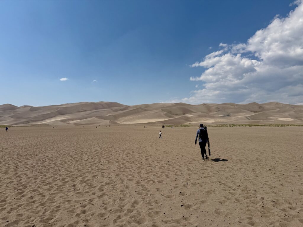 The sun is hot, plus you’re at altitude (8,200 feet), so it hits you even harder. That hot sun creates hot sand. You cannot go barefoot in the sand at Great Sand Dunes National Park in the summer.