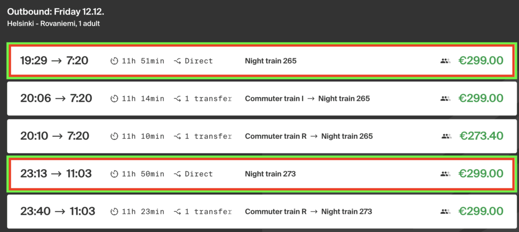 Instead, look for the words “Direct” (sometimes listed as “Express”) and “Night train.” These trains are on the Santa Claus Express. For added assurance, check the available sleeper cabins. If there are two levels of sleeper cabins, then it’s on the Santa Claus Express, double-decker train.