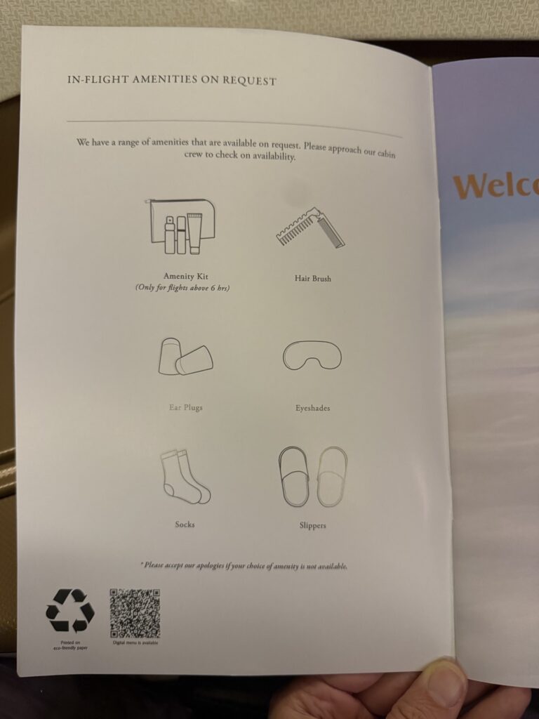 What wasn’t at my seat though, was an amenity kit. (Of course this was the one time I planned to rely on the amenity kit tooth brush.) I noticed on the menu card that amenity kits were available by request, so I again flagged down my flight attendant and asked for one. To my dismay (though I could have just looked at the photo), there was no toothbrush in side. Continue on the to sleep section for the end of that saga.