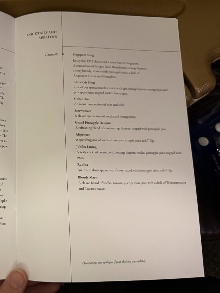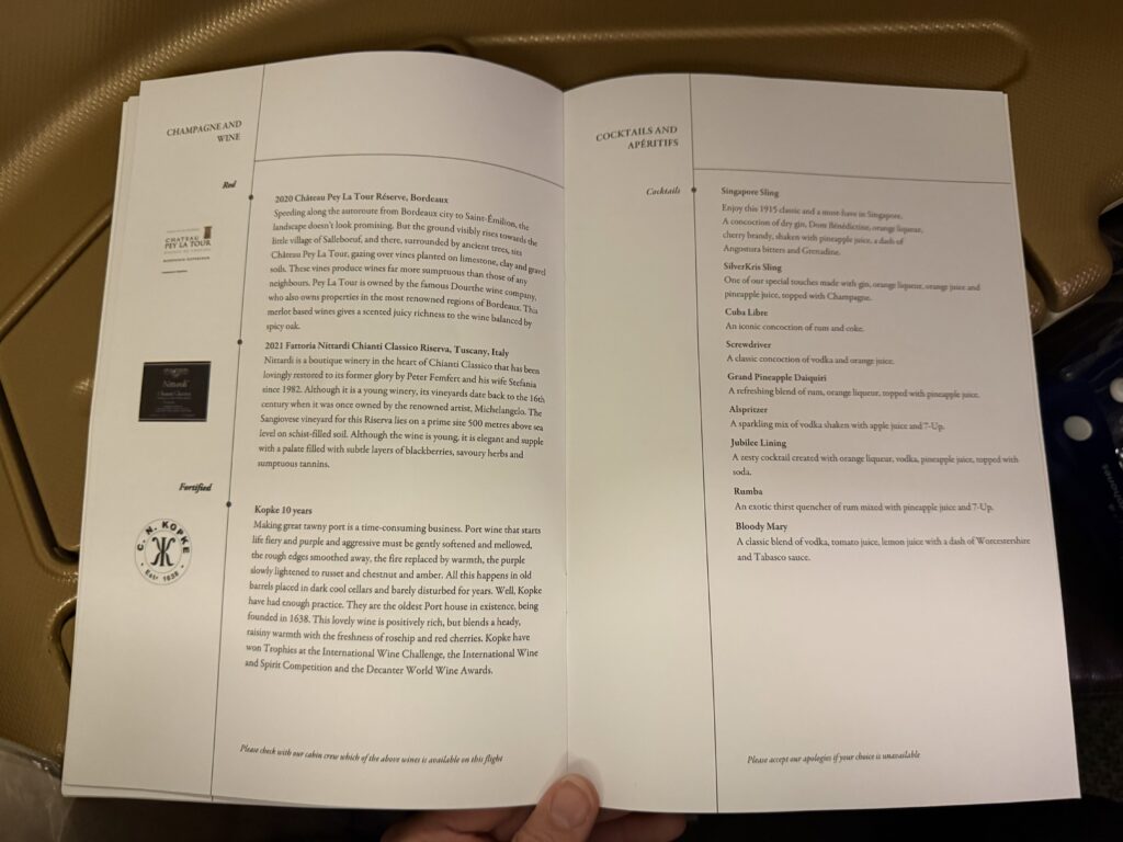 After she left, I actually took some time to read the menu. I saw that they had a long list of delightful cocktail options, including a Singapore Sling and a Grand Pineapple Daiquiri. I flagged down my flight attendant and asked if I could swap my drink order to a SilverKris Sling, their twist on the aforementioned classic. She was of course completely accommodating and did not make me feel like this was annoying nor weird (even though it probably was.)