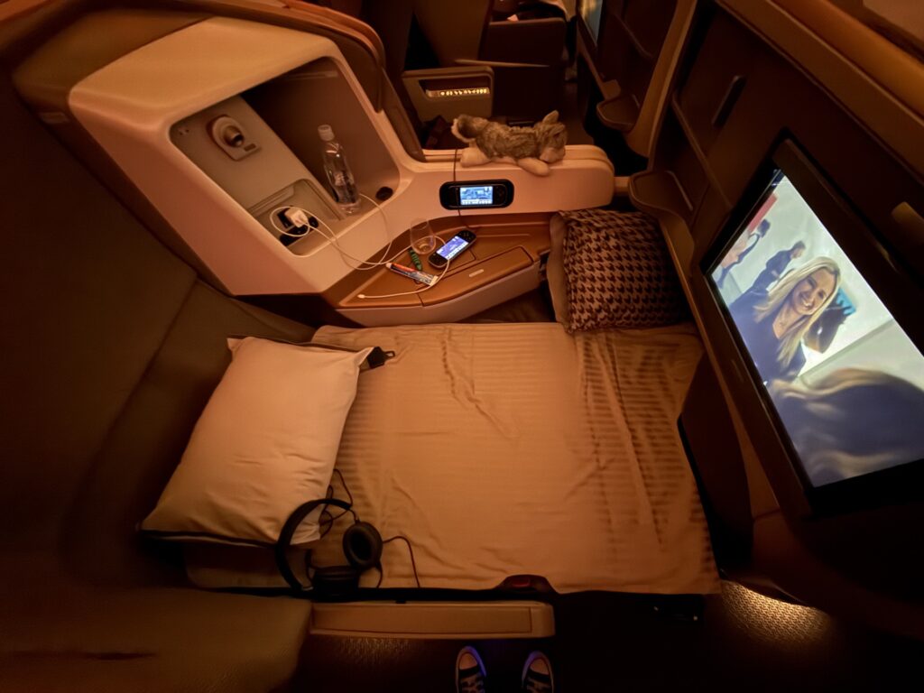 TLDR: The 78-inch bed is spacious and comfortable, but requires a flight attendant to set up. This particular flight doesn’t leave much time for sleep.