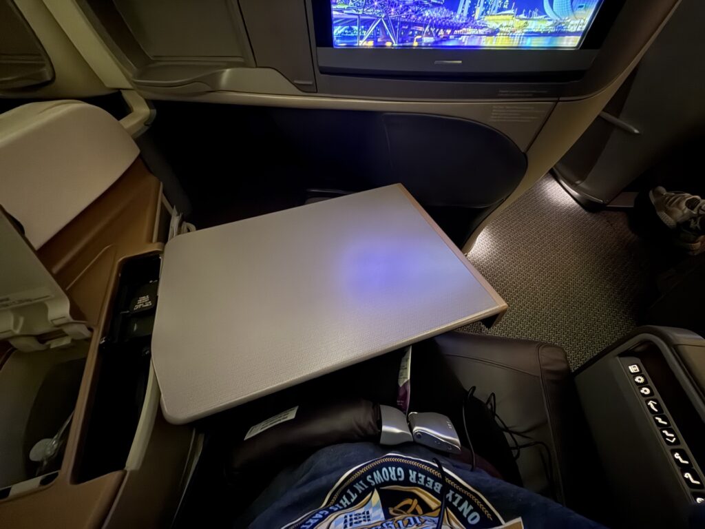The lack of in-seat storage is a common complaint of mine in premium cabins. I don’t know if this has something to do with the lie-flat seat’s physical infrastructure or they just assume that bountiful overhead bin space is good enough, but I constantly feel like there is not enough accessible spaces to put my stuff in business class seats.